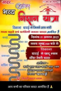 गांव खेड़ा खजुरिया (सोनकच्छ )से ओर गांव बाबई से करीबन 1500 श्याम प्रेमी हाथों में निशान लेकर श्री खाटू श्याम मंदिर नेवरी फाटा धाम पर आएंगे। वही मंदिर के पट दिन भर खुले रहेंगे। हजारों की संख्या में बाबा श्याम के दर्शन करेंगे। एवं रात्रि को संकीर्तन होगा जिसमें भजन गायिका वैष्णवी मेहता (नेवरी फाटा धाम) से और भजन गायक कनक – मयंक (इटारसी) से अपने भजनों बाबा को रिझाये गे।