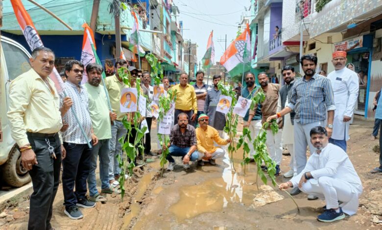 सतलापुर की टूटी सड़कों पर “बेशर्म के पौधे” – कांग्रेस का अनोखा विरोध प्रदर्शन