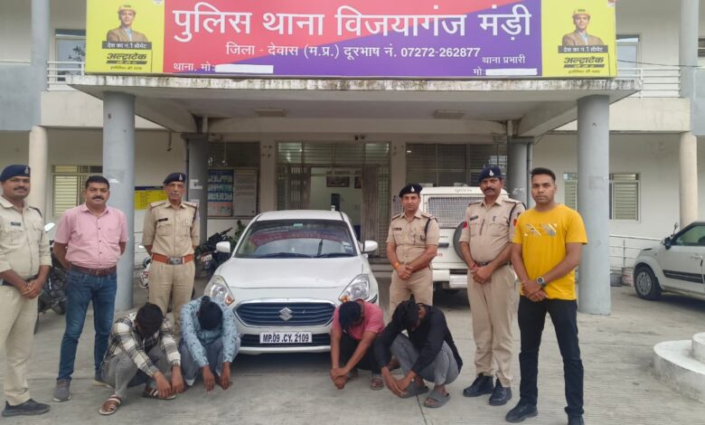 देवास। विजयागंज मंडी। थाना पुलिस ने कार चोरी के मामले का खुलासा करते हुए चार आरोपियों को गिरफ्तार कर उनके कब्जे से पांच लाख रुपए की एक स्विफ्ट डिज़ायर कार जप्त की है।